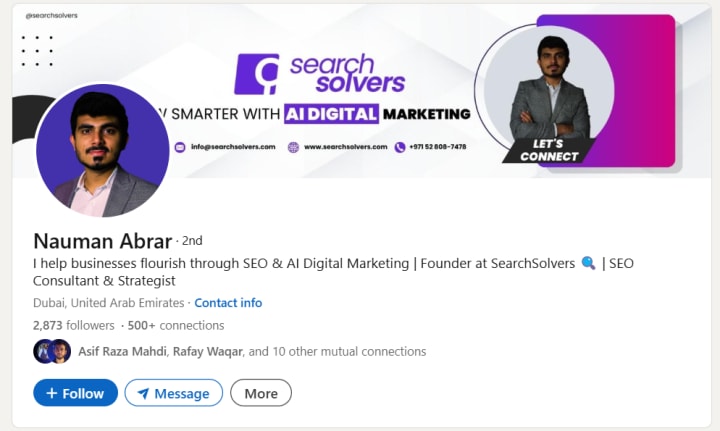 Nauman Abrar is an experienced SEO consultant and the founder of SearchSolvers. With over a decade of expertise, Nauman specializes in AI-infused digital marketing strategies. His services include SEO audits, keyword research, on-page and off-page SEO, and paid search campaigns. Nauman’s innovative use of AI tools and his commitment to organic growth make him a standout SEO expert in Dubai.