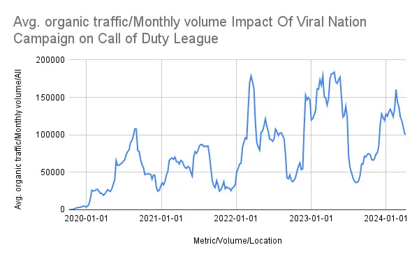 We at Influencer Marketing Hub made a comprehensive Ahrefs data analysis (find Google Sheet data format here) to verify the campaign’s massive impact, with organic traffic to the Call of Duty League website skyrocketing from a mere 40 visits to over 107,000 weekly visits during the marketing campaign period, unequivocally demonstrating Viral Nation’s capability to achieve unprecedented growth and engagement.