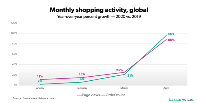 According to Bazaarvoice, April 2020 grew even faster than March across every indicator it tracked — including page views, order count, review submission and question submission.