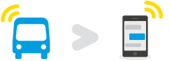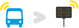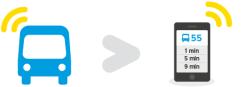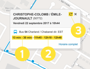 Real time is made possible thanks to vehicle geolocation. By knowing the exact position of every bus on the road, it is possible to predit at what time the bus will really arrive at a bus stop and to communicate this information to customers in real time. This information is displayed in minutes and is available 20 minutes before the bus arrives at the stop (e.g. bus in 15 minutes).