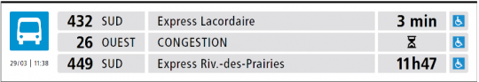 When there is heavy traffic, an hourglass pictogram with planned times replaces real times for a given bus. The words « Traffic congestion » appear in blue instead.