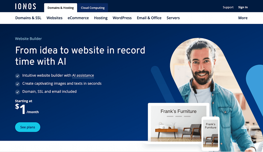 The IONOS Website Builder is another excellent option that’s also affordable. It’s especially great for beginners since it leverages AI to assist users as they create their custom websites. For instance, it enables you to create original images and text.